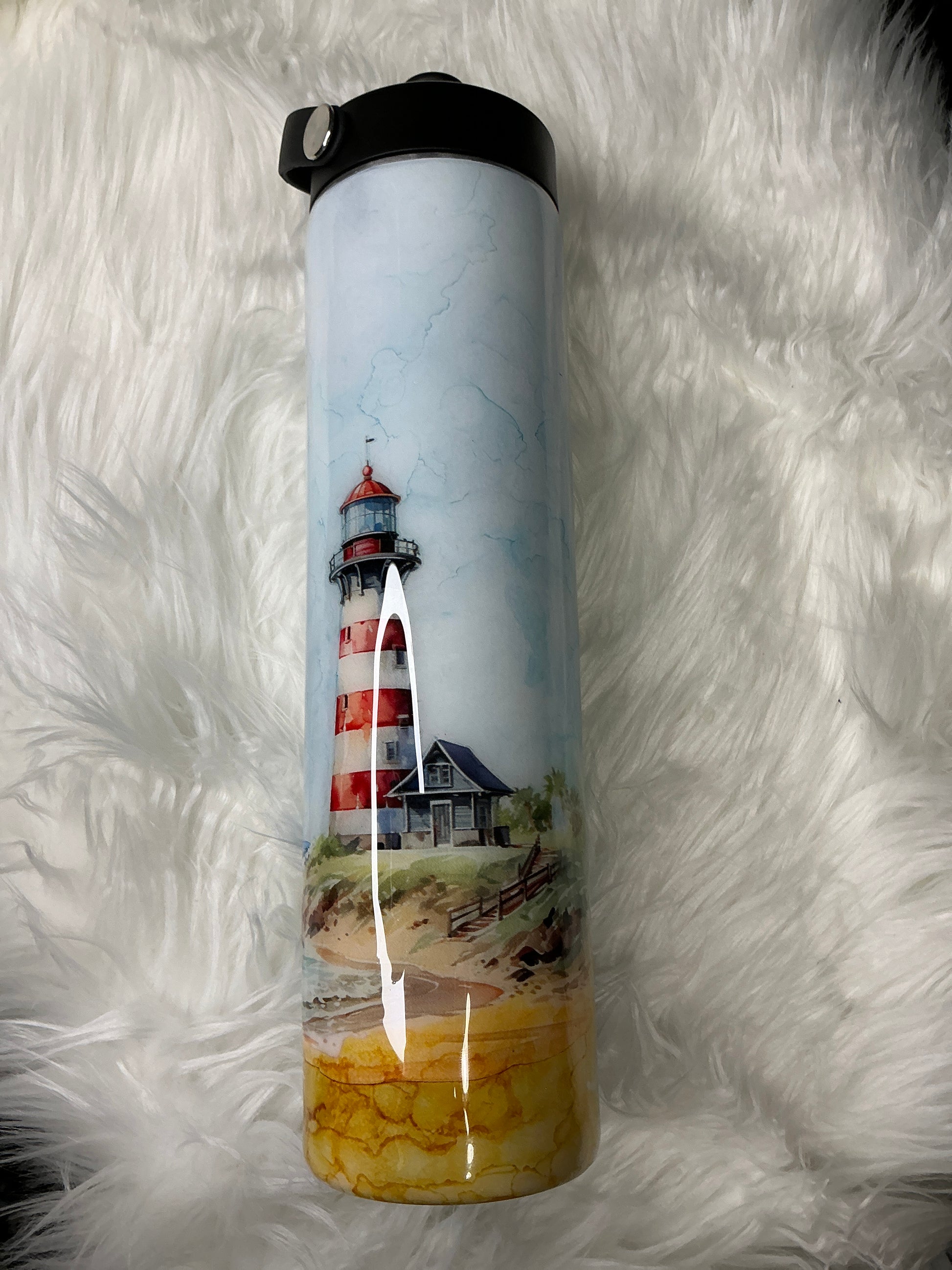 32 oz Plump with 2 lids in a beach theme with a lighthouse decal. Hand painted in inks.