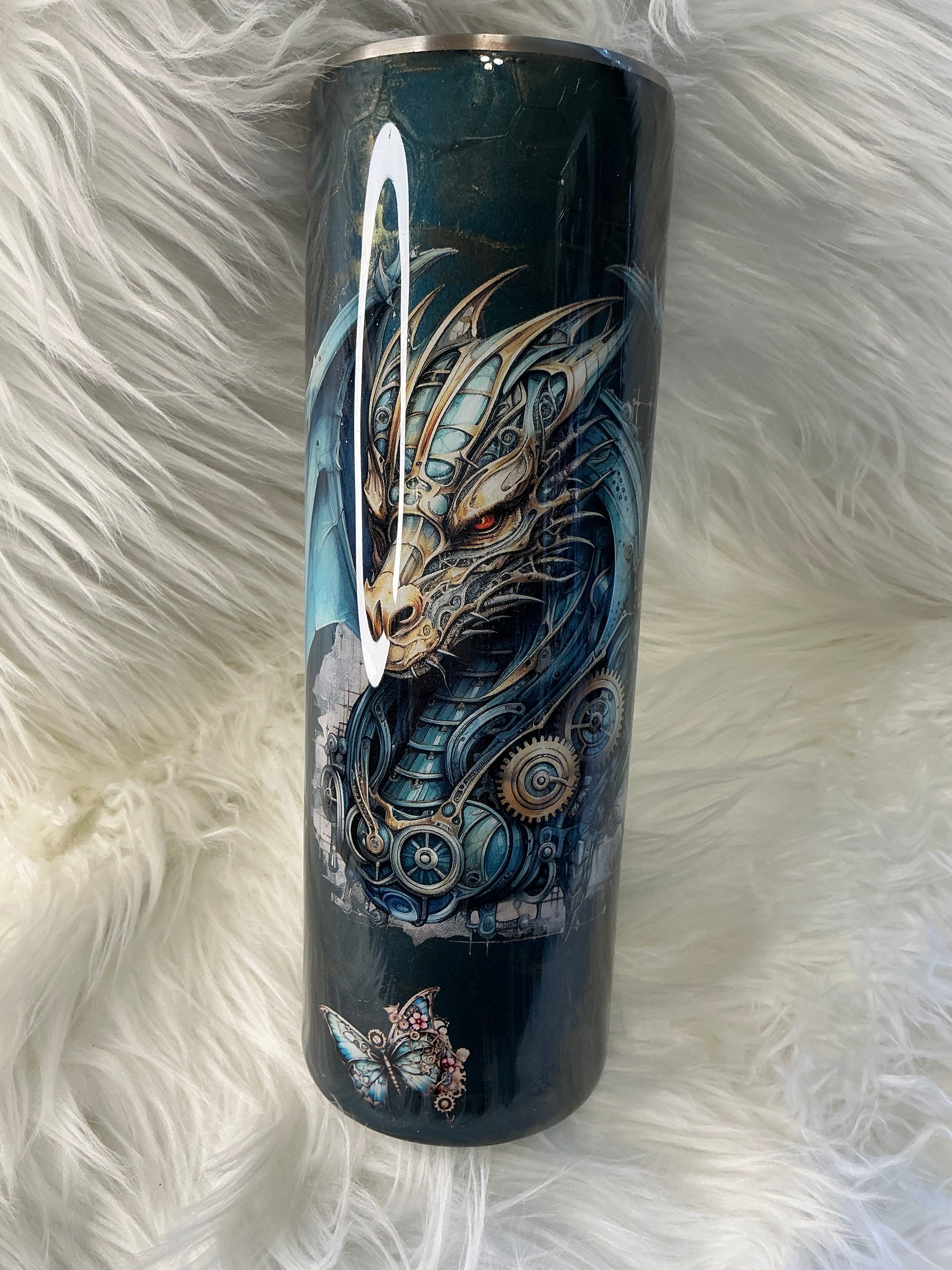 30 oz skinny in teal blue with dragon scales and gold burnishing and a dragon decal.